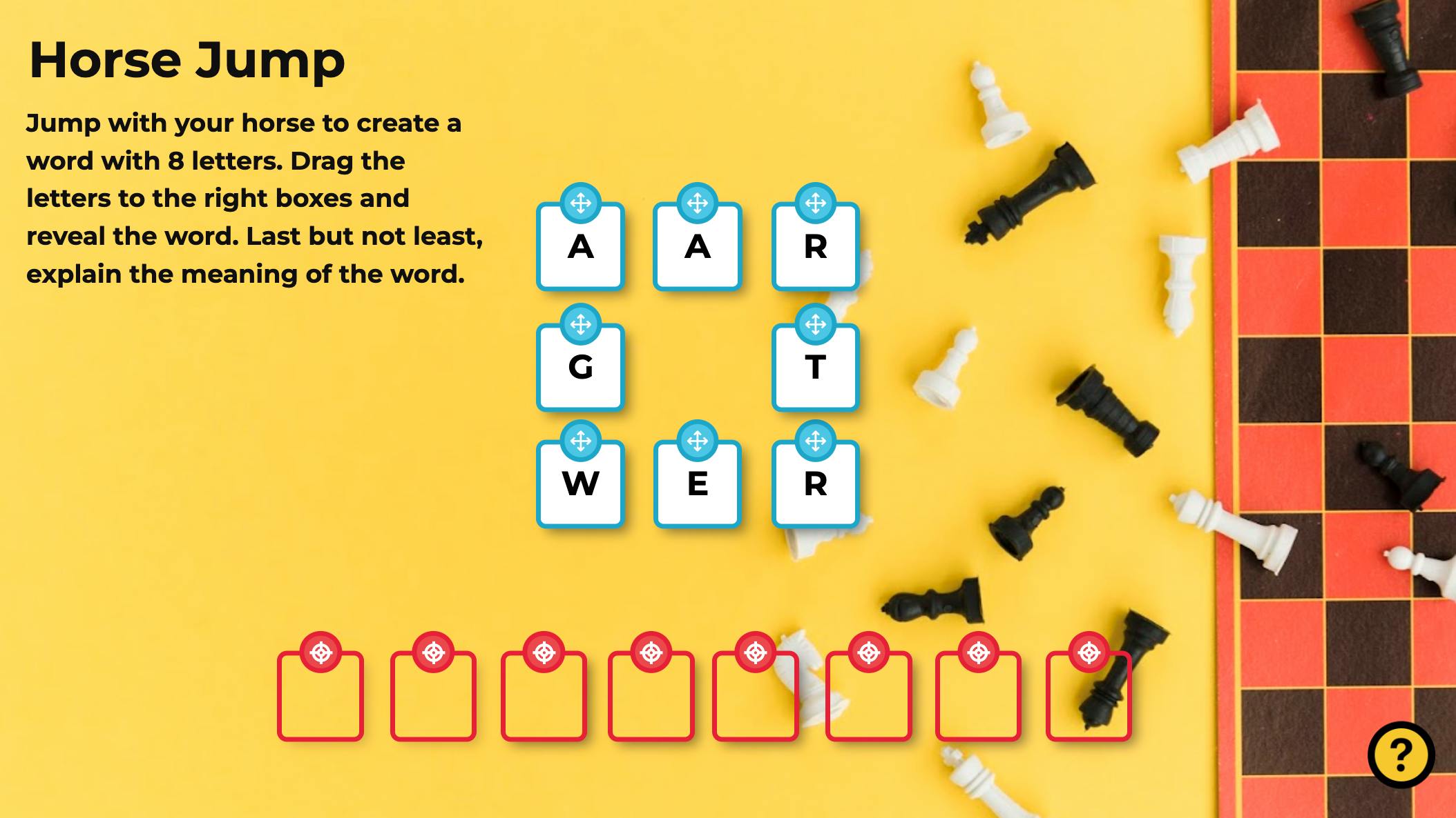 An engaging gamified learning technique that challenges students to decipher words and concepts through strategic leaps of letters. Inspired by the rhythmic motion of a horse's jump, this puzzle game encourages students to use their cognitive agility to unlock the hidden meaning behind words.